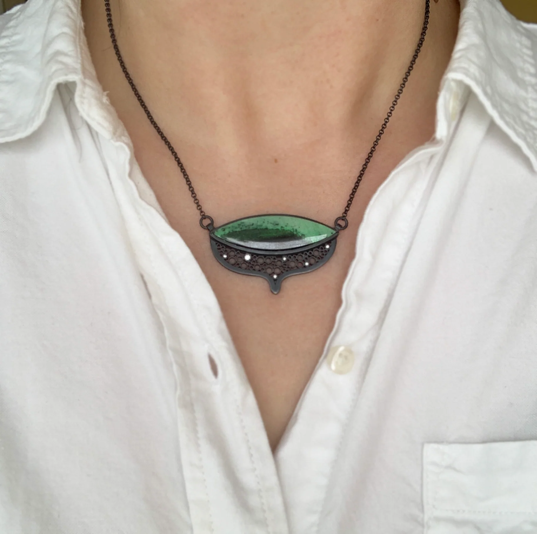 Be bold and dive into the deep sea of style and individuality with this necklace by Belle Brooke! This one-of-a-kind piece is crafted with oxidized silver and a gorgeous green garnet for a mythical look. It's sure to catch eyes, hearts, and maybe even a few sirens!